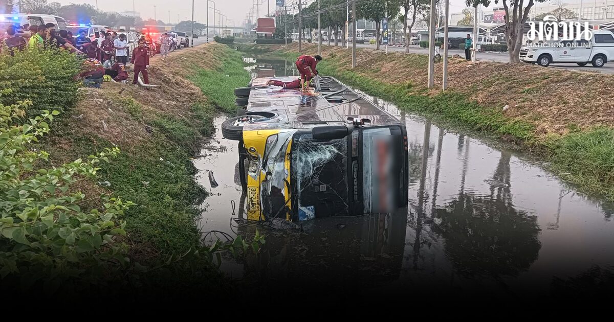 ระทึก! รถบัสรับส่งพนักงานบริษัท เสียหลักพลิกคว่ำตกคูน้ำ เจ็บ 14 จนท.เร่งนำส่งรพ.