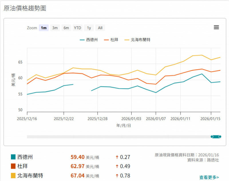 受到地緣政治風險升溫、原油價格走高影響,西德州原油每桶逼近60美元,而杜拜、北海布蘭特原油每桶早已破62美元、67美元之上,中油已經宣布1月19日起國內油汽、柴油價格每公...…