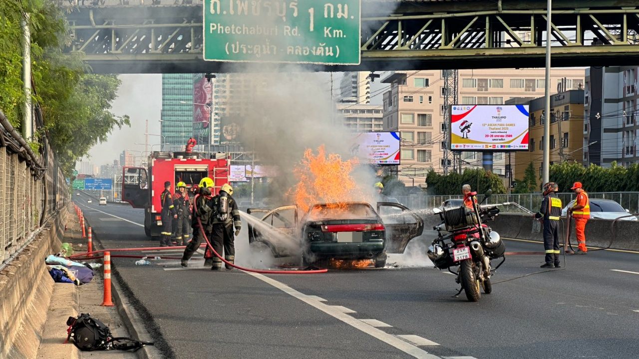 เกิดเหตุไฟไหม้รถยนต์เก๋ง กลางทางด่วน ถนนวิทยุ แขวงลุมพินี คนขับหนีออกมาได้ทัน คนขับหนีออกมาได้ หลังเพลิงสงบ พบรถเสียหายทั้งคัน