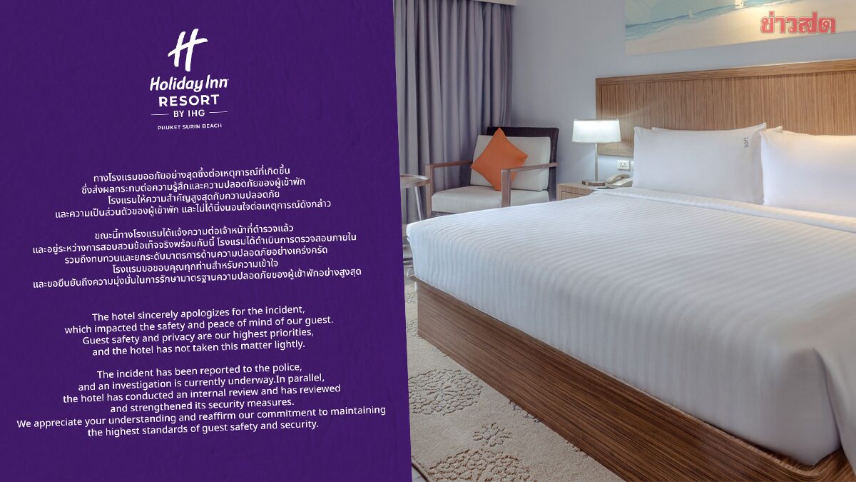 จากกรณีเฟซบุ๊ก Mirinda เล่าเหตุการณ์ระทึกโดนบุคคลปริศนาใช้คีย์การ์ดเปิดห้องและมีการแจ้งโรงแรมเพื่อตรวจสอบกล้องวงจรปิดแต่โรงแรมแจ้งว่าไม่มีใครเปิด จนล่าสุด มีรปภ.รร.ดังกล่าวเข้ามอบตัวแล้วนั้น เพจ Holiday Inn Resort Phuket Surin Beach ได้ออกแถลงการณ์บนเพจ ระบุว่า “ทางโรงแรมขออภัยอย่างสุดซึ้งต่อเหตุการณ์ที่เกิดขึ้น ซึ่งส่งผลกระทบต่อความรู้สึกและความปลอดภัยของผู้เข้าพัก โรงแรมให้ความสำคัญสูงสุดกับความปลอดภัยและความเป็นส่วนตัวของผู้เข้าพักและไม่ได้นิ่งนอนใจต่อเหตุการณ์ดังกล่าว ขณะนี้ทางโรงแรมได้แจ้งความต่อเจ้าหน้าที่ตำรวจแล้ว และอยู่ระหว่างการสอบสวนข้อเท็จจริง พร้อมกันนี้ โรงแรมได้ดำเนินการตรวจสอบภายใน รวมถึงทบทวนและยกระดับมาตรการด้านความปลอดภัยอย่างเคร่งครัด โรงแรมขอขอบคุณทุกท่านสำหรับความเข้าใจ และขอยืนยันถึงความมุ่งมั่นในการรักษามาตรฐานความปลอดภัยของผู้เข้าพักอย่างสูงสุด”