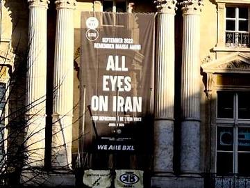 Met een spandoek aan het Brouckèreplein betuigt de Stad Brussel haar steun en solidariteit met het Iraanse volk. Het spandoek is opgehangen aan de gevel van Hotel Continental op het plein.