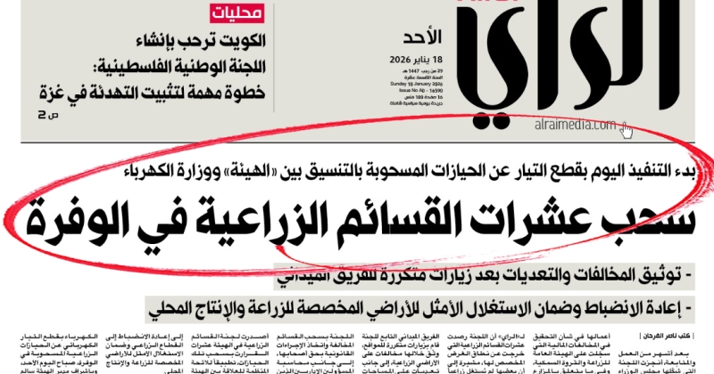 تأكيداً لما نشرته «الراي»، على صفحتها الأولى اليوم الأحد، وفي إطار جهودها الحازمة للتصدي للتجاوزات وحماية الأمن الغذائي، قامت الهيئة العامة للزراعة والثروة السمكية، بالتعاون مع وزا...