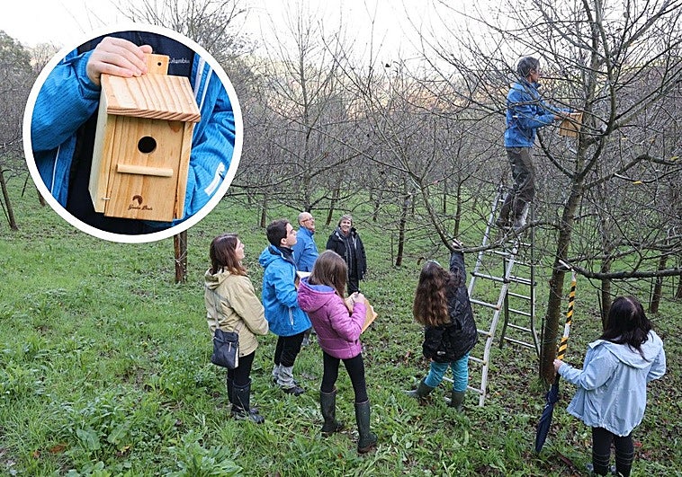 La asociación naturalista de Avilés coordinó una actividad en la que se colocaron cajas-nido, que a su vez promueven la presencia de aves insectívoras en este tipo de plantaciones con manzanos