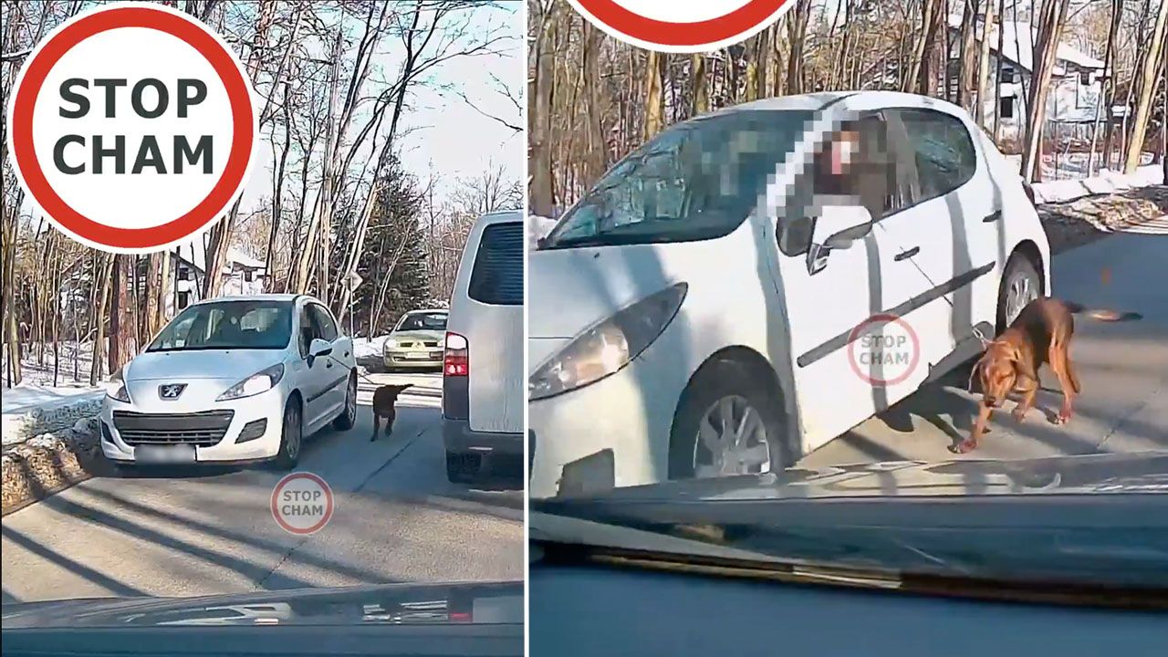 Senior jechał autem z psem trzymanym na smyczy przez okno