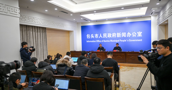 (260119) -- BAOTOU, Jan. 19, 2026 (Xinhua) -- This photo taken on Jan. 19, 2026 shows a press briefing on a factory blast in Baotou City, north China's Inner Mongolia Autonomous Region. An explosion at a factory in north China's Inner Mongolia Autonomous Region has killed two people, left eight missing and injured 84, local authorities said Monday. The explosion occurred at 3:03 p.m. on Sunday at a plate plant o