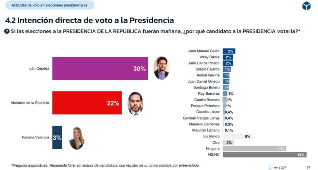 Este domingo se dieron a conocer los resultados de una nueva encuesta de Noticias RCN y la firma GAD3 que midió la intención de voto de los colombianos para las elecciones presidenciales , las consultas interpartidistas del 8 de marzo, posibles escenarios de segunda vuelta y las elecciones al Congreso de la República. En la pregunta sobre intención de voto presidencial —“Si las elecciones a la Presidencia de la República fueran mañana, ¿por qué candidato a la Presidencia votaría?”— Iván Cepeda aparece en primer lugar con 30 %, seguido por Abelardo de la Espriella con 22 %. En la medición también figuran Paloma Valencia con 3 %; Juan Manuel Galán , Vicky Dávila y Juan Carlos Pinzón con 2 % cada uno; y con 1 %, Sergio Fajardo , Aníbal Gaviria , Juan Daniel Oviedo , Santiago Botero , Roy Barreras , Camilo Romero y Enrique Peñalosa . Más abajo aparecen Claudia López y Germán Vargas Lleras con 0,4 % cada uno; Mauricio Cárdenas con 0,3 % y Mauricio Lizcano con 0,1 %. El voto en blanco registra 5 %; la opción “otro”, 2 %; “ninguno”, 11 %; y “no sabe/no responde”, 14 %. La encuesta también midió la intención de voto para la Gran Consulta por Colombia , que se realizará el 8 de marzo. En ese escenario, Paloma Valencia encabeza la preferencia con 23 %. Le siguen Vicky Dávila y Juan Manuel Galán con 8 % cada uno; Juan Carlos Pinzón con 6 %; Juan Daniel Oviedo con 4 %; Aníbal Gaviria con 3 %; Enrique Peñalosa con 2 %; y David Luna y Mauricio Cárdenas con 1 % cada uno. La opción “ninguno” alcanza 34 % y “no sabe/no responde” 9 %. Sobre el escenario de las consultas, el presidente de GAD3, Narciso Michavila , señaló que, “aunque es verdad que parece que Paloma Valencia es la que tiene más opciones, yo no lo dejaría cerrado porque, entre otras cosas, los que van a votar en la primera consulta no es el conjunto de todos los entrevistados. Por lo tanto, hay que ser muy prudentes”. “En el supuesto de que fuera Paloma Valencia la elegida en la Gran Consulta, podría revivir la historia que vivieron en su momento el presidente Uribe o el presidente Duque, que en estos momentos de las elecciones eran prácticamente unos desconocidos y gracias a sentarse como candidatos en sus respectivas opciones terminaron ganando ”, agregó el experto. En la Consulta del Pacto Amplio , también prevista para el 8 de marzo, Iván Cepeda registra 34 % de preferencia, seguido por Roy Barreras con 4 % y Camilo Romero con 3 %. La opción “ninguno” suma 44 % y “no sabe/no responde” 14 %. La encuesta incluyó posibles escenarios de segunda vuelta presidencial . En un enfrentamiento entre Iván Cepeda y Abelardo de la Espriella , Cepeda obtendría 40 % y De la Espriella 32 %. Frente a Sergio Fajardo , Cepeda marca 40 % y Fajardo 25 %. En un escenario entre Iván Cepeda y Paloma Valencia , Cepeda registra 43 % y Valencia 20 %. Contra Juan Carlos Pinzón , Cepeda obtiene 43 % y Pinzón 17 %. En un duelo entre Abelardo de la Espriella y Sergio Fajardo , De la Espriella suma 32 % y Fajardo 19 %. Entre Juan Carlos Pinzón y Sergio Fajardo , Pinzón marca 10 % y Fajardo 29 %. En un cruce entre Paloma Valencia y Sergio Fajardo , Valencia obtiene 17 % y Fajardo 28 %. En intención de voto para las elecciones al Congreso de la República , el Pacto Histórico registra 23 %, seguido por el Centro Democrático con 15 % y el Partido Liberal con 7 %. Aparecen luego Cambio Radical (4 %), Conservador (2 %) y con 1 % Independientes , MIRA , Alianza Verde y Salvación Nacional . Fuerza Ciudadana marca 0,5 %; La U 0,4 %; Verde Oxígeno y Nuevo Liberalismo 0,3 %; y LIGA 0,1 %. El voto en blanco alcanza 6 %, “no votaría/se abstiene” 14 % y “no sabe/no responde” 22 %. En relación con los niveles de indecisión reflejados en la encuesta, Michavila afirmó que “estas, ahora mismo, son las elecciones más inciertas de todas las que hemos vivido en las últimas décadas, no solo porque las sociedades cada vez sean más volátiles y fragmentadas, sino porque la propia ley, al haber censurado la opinión pública, hace que la propia opinión pública esté más indecisa que nunca. El escenario del año 2026 está más abierto que en todos los procesos electorales anteriores ”. Hacia el final de su análisis, el especialista afirmó que la izquierda llega a este momento del proceso electoral con un candidato ya definido y que “el más elegido en la consulta de izquierdas va a ser Iván Cepeda”, con altas probabilidades de pasar a la segunda vuelta. Sin embargo, advirtió que ese paso no garantiza una victoria en el balotaje , pues puede producirse una concentración del voto contrario, como ha ocurrido en otros países. Por eso, señaló que el escenario sigue abierto y resumió tres posibilidades: que Cepeda gane la Presidencia, que llegue a segunda vuelta pero enfrente una mayoría que no quiera continuar con el actual gobierno, o que “cualquiera de los otros candidatos dé la sorpresa”. Según la ficha técnica de Noticias RCN, la encuesta se realizó entre el 13 y el 15 de enero de 2026, con personas mayores de 18 años residentes en Colombia, mediante entrevistas telefónicas. El margen de error es de 2,83 % y el nivel de confianza del 95 %.