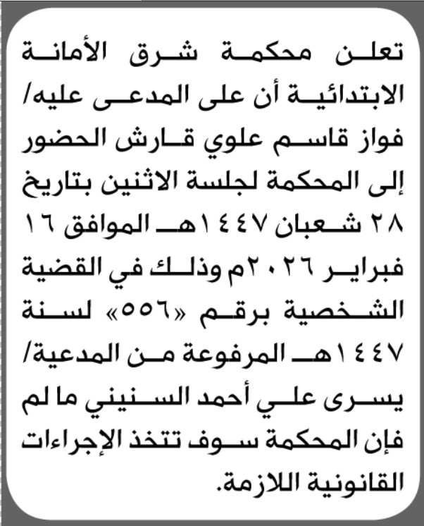 تعلن محكمة شرق الأمانة بأن على/ فواز قاسم قارش الحضور إلى المحكمة