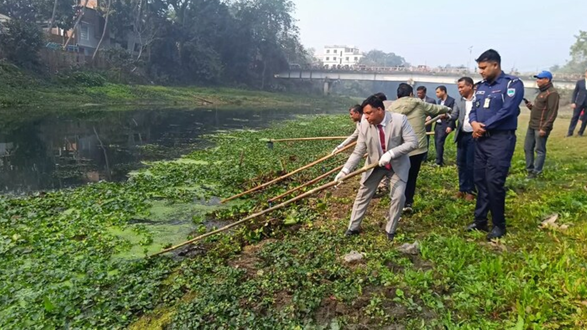 পরিবেশের ভারসাম্য রক্ষা ও নদী পুনরুজ্জীবিত করার লক্ষ্যে ঝিনাইদহের নবগঙ্গা নদীর পরিচ্ছন্নতা অভিযান শুরু হয়েছে।সোমবার (১৯ জানুয়ারি) সকালে শহরের নবগঙ্গা নদীর ক্যাসেল ব্রিজ সংলগ্ন এলাকায় ৩ দিন ব্যাপী এই পরিচ্ছন্ন অভিযানের উদ্বোধন করেন জেলা প্রশাসক আব্দুল্লাহ আল মাসউদ। এ সময় স্থানীয় সরকারের উপ-পরিচালক রথীন্দ্রনাথ রায়, অতিরিক্ত জেলা প্রশাসক সাইফুর রহমান, ঝিনাইদহ পানি উন্নয়ন বোর্ডের নির্বাহী প্রকৌশলী রঞ্জন কুমার দাস, উপ-সহকারী প্রকৌশলী কাজী মহসিন উদ্দিন, ঝিনাইদহ পরিবেশ অধিদফতরের সহকারী পরিচালক মুন্তাছির রহমান, ঝিনাইদহ প্রেসক্লাবের সভাপতি আসিফ ইকবাল মাখন, সাধারণ সম্পাদক আমিনুল ইসলাম লিটনসহ অন্যান্যরা উপস্থিত ছিলেন। আরও পড়ুন: ঝিনাইদহে মুদি দোকানি গুলিবিদ্ধ জেলা প্রশাসন ও পানি উন্নয়ন বোর্ডের আয়োজন এ অভিযান চলবে আগামী ২১ জানুয়ারি পর্যন্ত। আরও পড়ুন: ঝিনাইদহে দখলমুক্ত হলো ১৩১ শতাংশ সরকারি জমি শহরের ক্যাসেল ব্রিজ ত্রিমোহনা থেকে চাকলাপাড়া ব্রিজ পর্যন্ত নদীর দুই পাড় পরিষ্কার, কচুরিপানা অপসারণ করা হবে বলে জানিয়েছে আয়োজকরা।