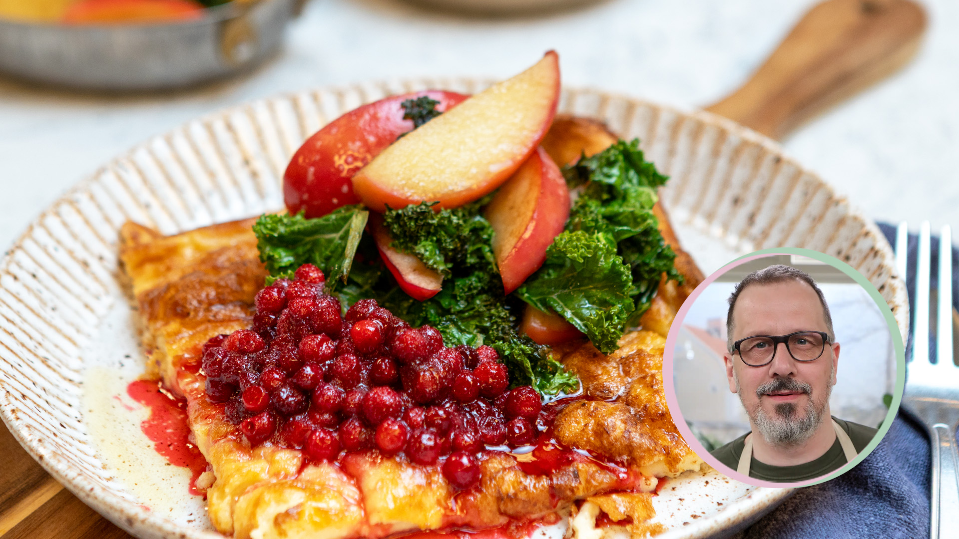 Dagens middagstips bjuder på en matig ugnspannkaka som efter gräddning toppas med ett fräs på grönkål och äpple samt rårörda lingon och brynt smör. Se Stefan Ekengrens recept