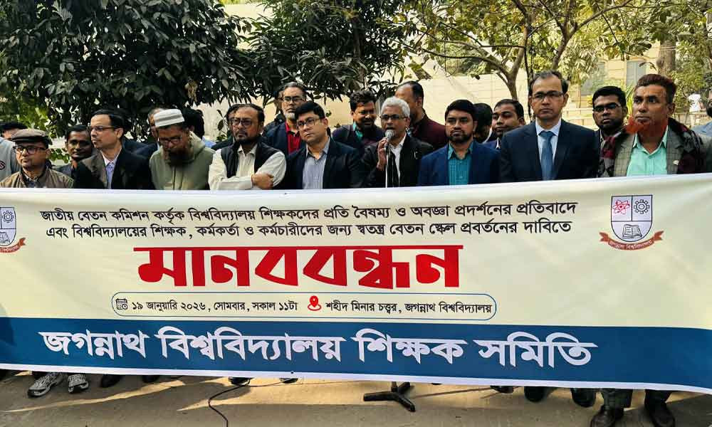 স্বতন্ত্র বেতন স্কেলের দাবিতে জবি শিক্ষক সমিতির মানববন্ধন