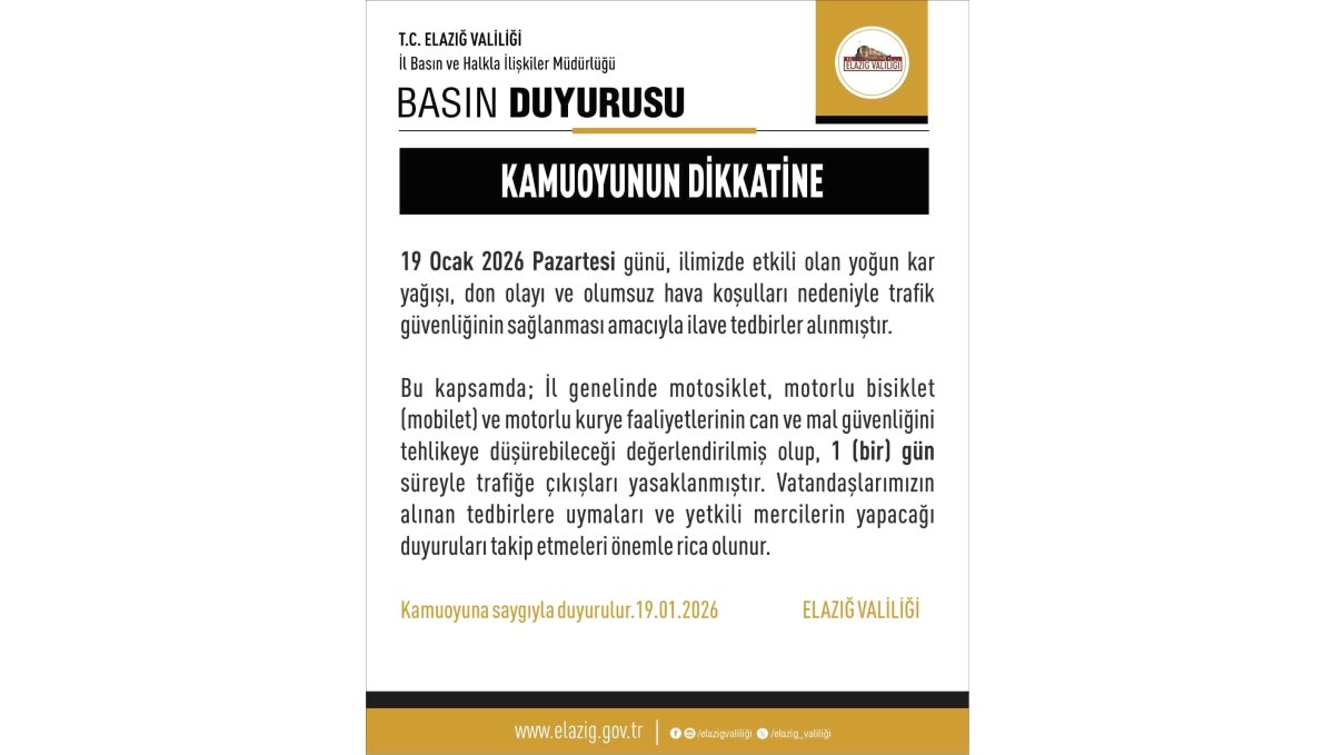 Elazığ'da yoğun kar yağışı nedeniyle motosiklet, mobilet ve motorlu kuryelerin trafiğe çıkışları yasaklandı.