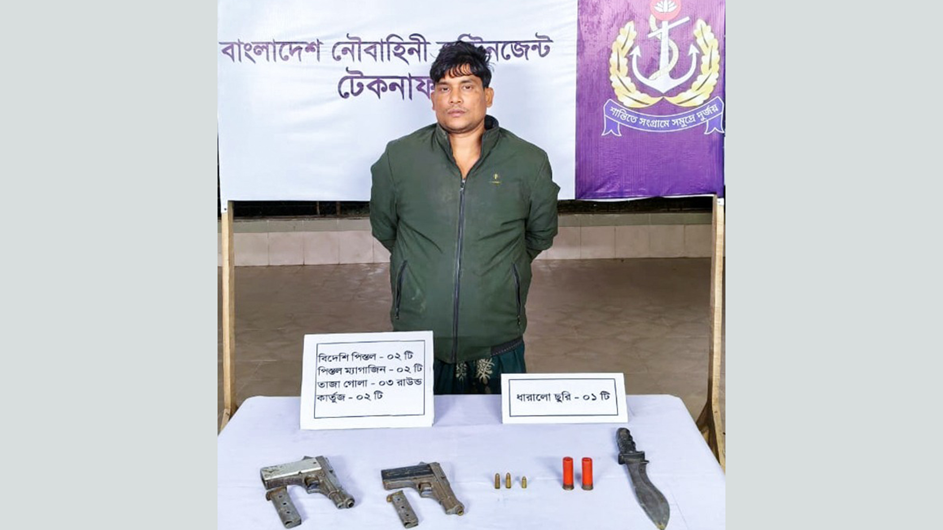 কক্সবাজারের টেকনাফ থেকে বিদেশি পিস্তল, গুলি ও ধারালো অস্ত্রসহ ওয়ারেন্টভুক্ত এক আসামিকে গ্রেফতার করেছে নৌবাহিনী। সোমবার (১৯ জানুয়ারি) বিকেলে এক বার্তায় নৌবাহিনীর পক্ষ থকে এ তথ্য জানানো হয়।নৌবাহিনী জানায়, আসন্ন ত্রয়োদশ জাতীয় সংসদ নির্বাচনকে সামনে রেখে অপরাধমূলক কার্যক্রম প্রতিরোধ ও আইনশৃঙ্খলা পরিস্থিতি সমুন্নত রাখতে অভিযান ও টহল চালায় নৌবাহিনী।অভিযানে নৌ কন্টিনজেন্ট এবং স্পেশাল ফোর্স (সোয়াডস্) রাতের অন্ধকারে ধাওয়া করে সোমবার ভোররাতে টেকনাফে নাজিরপাড়া এলাকা থেকে একাধিক মামলার ওয়ারেন্টভুক্ত শীর্ষ সন্ত্রাসী শামশুল হককে গ্রেফতার করতে সক্ষম হয়।আরও পড়ুন: বান্দরবান সীমান্তে অস্ত্র ও গুলিসহ মিয়ানমার যুবক আটকগ্রেফতার সন্ত্রাসীর তথ্যের ভিত্তিতে তার তরমুজ ক্ষেতের ছাপড়া ঘর থেকে দুটি বিদেশি পিস্তল, তিন রাউন্ড তাজা গুলি, শর্টগানের দুই রাউন্ড গুলি এবং একটি দেশীয় ধারালো অস্ত্র জব্দ করা হয়। শীর্ষ সন্ত্রাসী শামশুল হক দীর্ঘদিন ধরে মাদক পাচার, মানুষকে জিম্মি করে অর্থ আদায় ও জোরপূবর্ক জমি দখলসহ বিভিন্ন অপরাধমূলক কর্মকাণ্ডের সঙ্গে জড়িত।বর্তমান সরকার ও নির্বাচন কমিশনের নির্দেশনা বাস্তবায়নে আসন্ন ত্রয়োদশ জাতীয় সংসদ নির্বাচনকে সামনে রেখে সমুদ্র ও উপকূলীয় এলাকার নিরাপত্তা নিশ্চিতকরণে নৌবাহিনীর নিয়মিত অভিযান অব্যাহত রয়েছে।আরও পড়ুন: সমুদ্রে কোস্টগার্ডের সঙ্গে গোলাগুলিতে ডাকাত নিহত, অস্ত্র-গুলিসহ আটক ১৯পাশাপাশি অভ্যন্তরীণ সন্ত্রাস, মাদক ও অন্যান্য অপরাধমূলক কর্মকাণ্ড প্রতিরোধে নৌবাহিনী সক্রিয় ভূমিকা পালন এবং একটি সুষ্ঠু, সুন্দর ও অবাধ নির্বাচন নিশ্চিত করার লক্ষ্যে ০৮টি জেলার অন্তভুক্ত ১৬টি সংসদীয় আসনে ২৫টি কন্টিনজেন্টে প্রায় ৫ হাজার নৌবাহিনী সদস্য মোতায়েন রয়েছে।