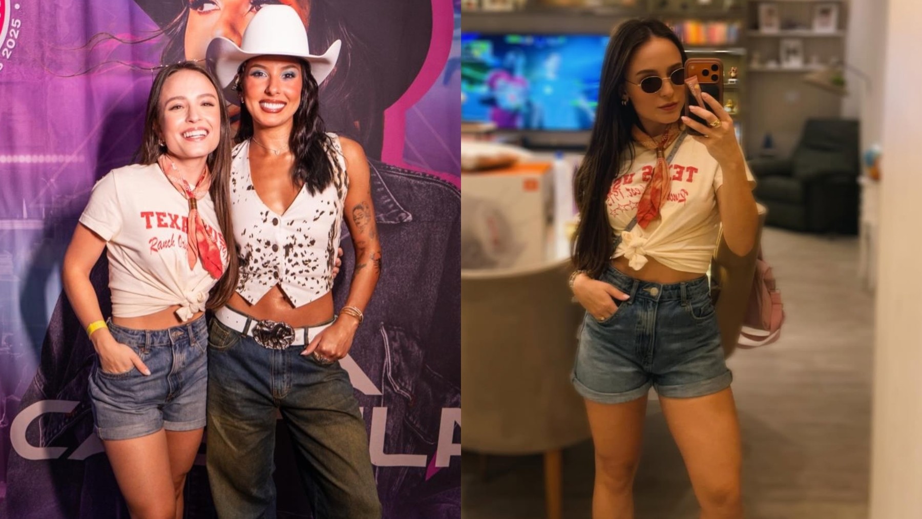 Larissa Manoela transformou o show de Ana Castela no Universo Spanta, no Rio de Janeiro, em uma aula prática de como incorporar referências country ao guarda-roupa urbano. Ao lado do marido, André Luiz Frambach, a atriz entrou no clima do evento com escolhas que dialogam com a tendência western, hoje revisitada de forma mais leve e fashionista. Macacão de pedraria e efeito segunda pele: look de Virgínia em ensaio da Grande Rio rende comentário de Vini Jr. Tricô no verão: Bruna Marquezine elege look em tom terracota e dita tendência; veja o valor Para a ocasião, Larissa apostou em uma camiseta branca com estampa em tom rosado e a palavra "Texas", arrematada com um nó na barra, recurso simples que atualiza a peça e cria efeito cropped. O short jeans de lavagem clássica manteve o visual casual, enquanto o tênis All Star preto ganhou personalidade extra com a mistura de cadarços branco e vermelho, detalhe que reforça a estética jovem e despretensiosa. Larissa Manoela entrou no clima country em show de Ana Castela Reprodução Instagram O toque temático apareceu no lenço usado no pescoço, finalizado com fivela dourada, acessório-chave da estética country contemporânea. Larissa Manoela e Ana Castela Reprodução Instagram Já Ana Castela seguiu fiel ao seu estilo, que se tornou marca registrada. No palco, a cantora surgiu com colete cropped branco com manchas pretas, calça jeans de cintura baixa, cinto branco com fivela oversized, bota branca de bico fino e chapéu country, um conjunto que traduz bem a força do western pop na moda atual, equilibrando sensualidade e identidade. Larissa Manoela posou com Ana Castela em bastidor de show Reprodução Instagram Nas redes sociais, Larissa celebrou o encontro com entusiasmo, destacando a experiência de assistir ao show no Rio. "Finalmente nosso encontro saiu. Só @anacastelacantora sabe o quanto insisti por esse show no Rio. Eu queria muito! E posso afirmar com toda certeza que foi um dos melhores shows que eu já assisti, uma energia única! É muito lindo e emocionante ver uma artista brasileira tão jovem como a Ana se realizando e brincando em cima do palco. Ela contagia, ela anima, ela se diverte, ela canta, dança, se joga e o mais lindo disso, ela não deixa de ser quem ela é. Sua essência, autenticidade, talento e humildade são admiráveis. Não é atoa que você tá onde tá! Eu sou muito sua fã e tô feliz demais com nosso encontro, que venham muitos outros! Parabéns pra você e toda equipe! Que show. Estamos te esperando pro churrasco hein? ps: a gente soube o repertório do show todo e até pro ballet nos candidatamos, se precisar tamo aí Ana kkkkk", escreveu a atriz. Ana Castela respondeu com carinho: "Eu amei ter vocês lá! Serão sempre bem vindos!". Ana Castela posou com Larissa Manoela e André Luiz Frambach Reprodução Instagram O momento ilustra a permanência da estética country no radar da moda, agora reinterpretada de forma mais sutil e urbana. Em vez de produções literais, a tendência ganha força quando aparece em detalhes estratégicos, capazes de atualizar o visual sem carregar a composição. Pequenos truques de styling também ajudam a transformar peças básicas. A camiseta, por exemplo, deixa de ser coadjuvante ao ganhar novos usos, com amarrações, assimetrias ou usada de forma ajustada à cintura, ela redefine proporções e acrescenta personalidade ao look, mantendo o ar casual. Larissa Manoela entrou no clima country em show de Ana Castela Reprodução Instagram