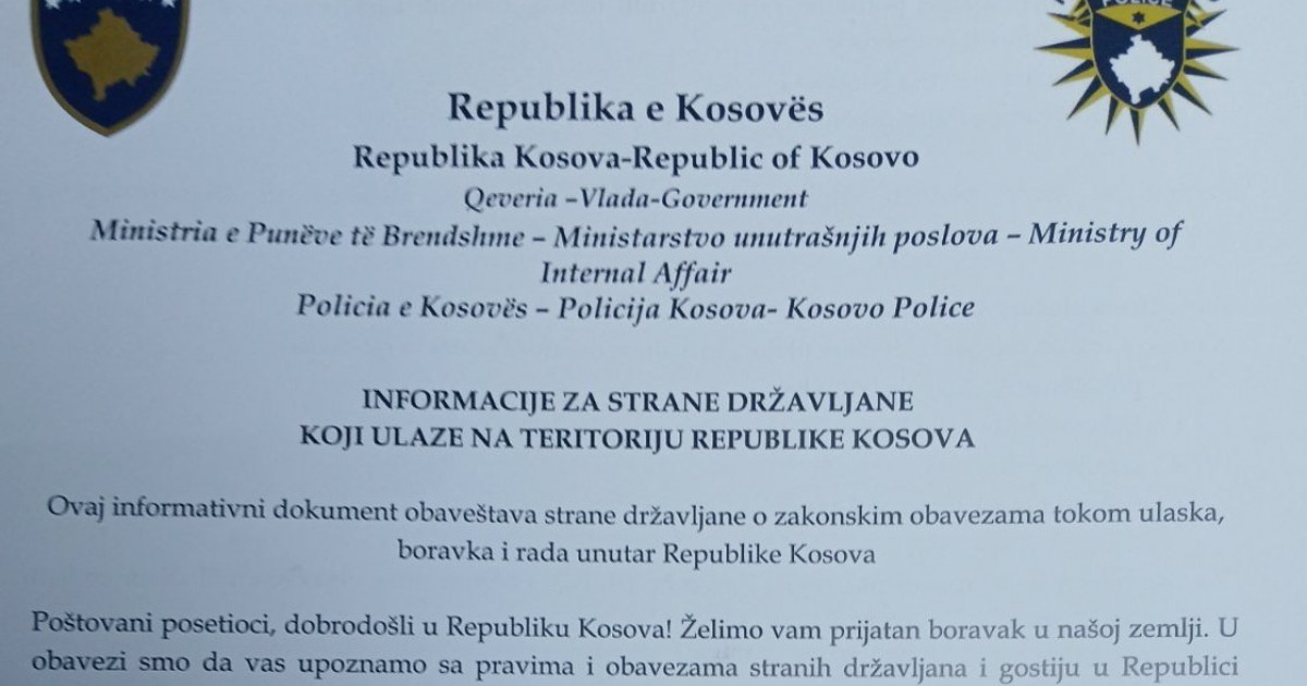 At administrative crossings, as part of an information campaign conducted by Kosovo’s Ministry of Internal Affairs and in connection with the implementation of the Law on Foreigners and the Law on Vehicles, travelers are being handed an instruction informing them of their obligations when entering, staying in, and working in Kosovo.