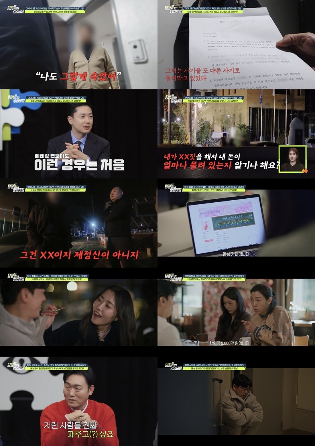 80대 노인을 가스라이팅해 수억원을 갈취한 ‘100억 자산녀’의 충격적인 ‘사기 돌려막기’ 실체가 드러나며 시청자들의 공분을 샀다. 19일 방송된 채널A ‘탐정들의 영업비밀’ 속 ‘탐정 24시’에서는 80대 노인을 상대로 수억원을 가로챈 100억 자산녀의 민낯이 낱낱이 공개됐다. 지난주 의뢰인은 “어머니가 자칭 ‘100억 자산녀’에게 속아 5억원이 넘는 피해를 입었다”며 탐정단에 도움을 요청했다. 당초 의뢰인의 어머니는 소고기 사업을 한다는 강씨(가명) 일당에게 5000만원을 빌려줬고, 이들의 빚을 대신 갚겠다며 100억 자산녀가 나타나면서 악연이 시작됐다. 그녀는 “보증을 잘못 서 100억 통장이 압류됐다”며 압류 해지를 명목으로 의뢰인 어머니의 모든 현금 자산을 가져갔고, 급기야 집과 상가에는 근저당까지 설정됐다.백호 탐정단은 사실 확인을 위해 100억 자산녀의 마지막 주소지인 고시텔을 찾아갔다. 하지만 그녀는 그곳에 산 적이 없었고, 고시텔 관계자는 “전입 신고만 해