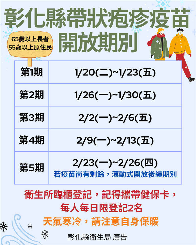上路了!為了不讓俗稱「皮蛇」的帶狀疱疹折磨老人家,彰化縣政府自購2萬劑帶狀疱疹疫苗,今天(20日)起開始接種,首波由低收入及中低收入戶長者優先施打,全額免費,一般長者今起也同步...…