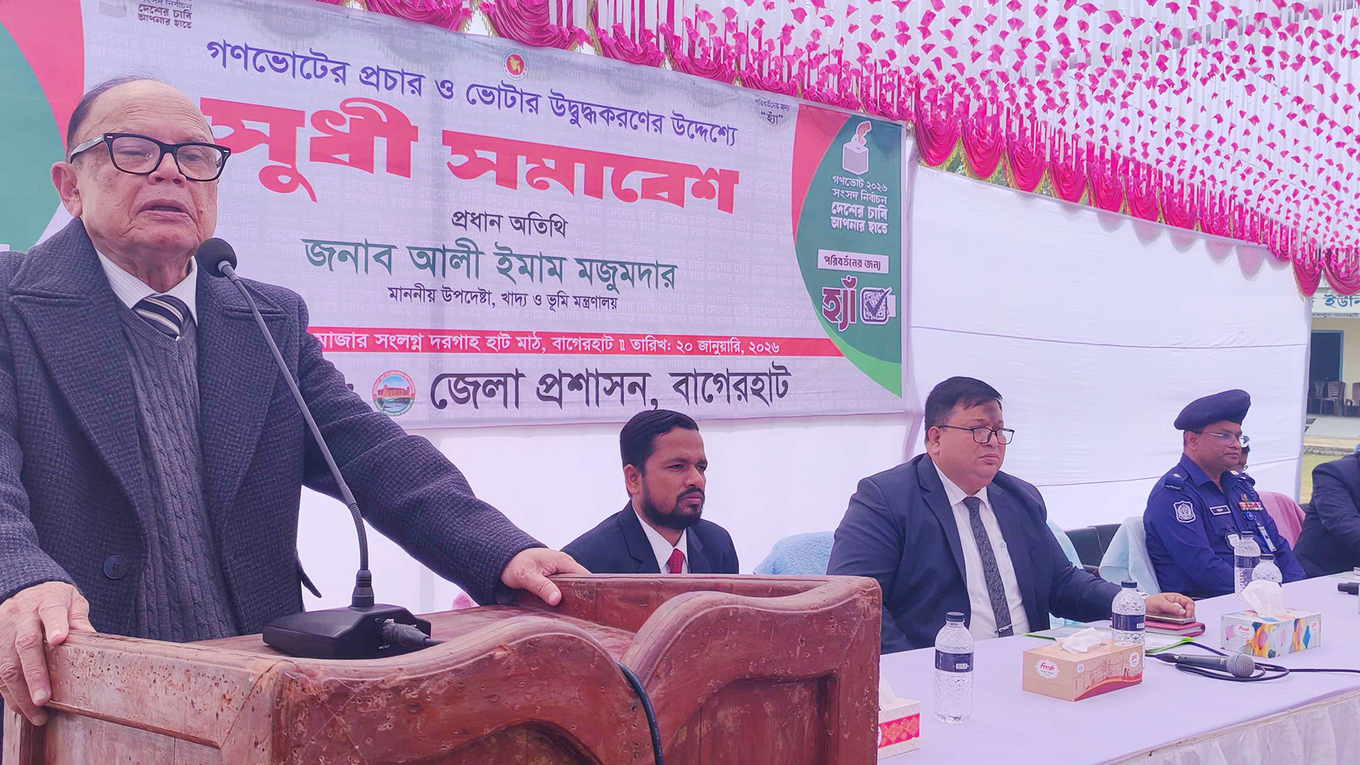 খাদ্য ও ভূমি মন্ত্রণালয়ের উপদেষ্টা আলী ইমাম মজুমদার বলেছেন, ‘ভোটের ব্যাপার নিয়ে আপনাদের কাছে প্রার্থীরা যাচ্ছেন, এটা তাদের অধিকার, আর আপনারা কাকে ভোট দেবেন সেটা আপনাদের অধিকার।’মঙ্গলবার (২০ জানুয়ারি) দুপুরে বাগেরহাট সদরের মাজারসংলগ্ন মাঠে গণভোটের প্রচার ও ভোটারদের উদ্বুদ্ধকরণের সুধী সমাবেশে প্রধান অতিথির বক্তব্যে খাদ্য উপদেষ্টা এসব কথা বলেন।তিনি বলেন, ‘আপনাদের ভোটোর অধিকার যাতে কেউ খর্ব না করতে পারে সেটা নিশ্চিত করবে নির্বাচন কমিশনের অধীনে থাকা জেলা প্রশাসক, পুলিশ সুপারসহ সব কর্মকর্তা। আপনার ভোট আপনি দেবেন, যাকে খুশি, যে মার্কায় খুশি সে মার্কায় দেবেন। এই প্রক্রিয়া কেউ বাধা দিতে পারবে না।’গণভোট বিষয়ে উপদেষ্টা বলেন, এই দেশটা আগামী পাঁচ বছর কীভাবে চলবে, বা পরবর্তীতে কীভাবে চলবে তা নির্ভর করে এই জুলাই সনদ অর্থ্যাৎ গণভোটে হ্যাঁ দেয়ার ওপর। আর কারা দেশ চালাবে তা নির্ভর করবে আপনাদের ওপর।’এ সময় গণভোটে হ্যাঁ ভোট দেয়ার জন্য সবাইকে অনুরোধ করেন উপদেষ্টা আলী ইমাম মজুমদার।আরও পড়ুন: আমরা গোটা দেশেই উৎসবমুখর পরিবেশে নির্বাচন চাই: উপদেষ্টা আলী ইমামতিনি আরও বলেন, ‘আগামীতে কারা দেশ চালাবে সে সিদ্ধান্ত আপনাদের হাতে। অর্থাৎ আপনারা যাকে ভোট দেবেন, তারাই আগামীতে দেশ চালাবে। আপনাদের ভোটেই আগামীতে দেশের ভবিষ্যৎ নির্ধারিত হবে।’বাগেরহাটের জেলা প্রশাসক গোলাম মো. বাতেনের সভাপতিত্বে অনুষ্ঠিত সুধী সমাবেশে আরও বক্তব্য দেন: পুলিশ সুপার মোহাম্মদ হাসান চৌধুরী, জেলা নির্বাচন অফিসার মোহাম্মদ আবু আনসার, জেলা তথ্য কর্মকর্তা মুঈনুল ইসলাম।সুধী সমাবেশে শিক্ষক, ইমামসহ সমাজের গণ্যমান্য ব্যক্তি উপস্থিত ছিলেন।এ দিকে সকালে একই স্থানে গণভোটের প্রচার ও ভোটার উদ্বুদ্ধকরণে ইসলামিক ফাউন্ডেশনের আয়োজনে বাগেরহাট জেলা পর্যায়ে ইমাম সম্মেলন অনুষ্ঠিত হয়েছে। বাগেরহাটের অতিরিক্ত জেলা প্রশাসক (সার্বিক) মো. মমিনুর রহমানের সভাপতিত্বে সম্মেলনে প্রধান অতিথি ছিলেন বাগেরহাটের জেলা প্রশাসক গোলাম মো. বাতেন।আরও পড়ুন: দেশে খাদ্য সংকটের আশঙ্কা নেই: খাদ্য উপদেষ্টাসম্মেলনে বিশেষ অতিথি হিসেবে উপস্থিত ছিলেন: বাগেরহাটের পুলিশ সুপার মোহাম্মদ হাসান চৌধুরী, জেলা নির্বাচন কর্মকর্তা মুহাম্মদ আবু আনসার, গণযোগাযোগ অধিদফতরের উপপরিচালক মুইনুল ইসলাম, বাগেরহাট কামিল মাদ্রাসার অধ্যক্ষ মোহাম্মদ আবুল কালাম শেখ, সরল কওমি মাদ্রাসার মুহতামিম মোহাম্মদ আশিকুর রহমান, বাগেরহাট জেলা ইমাম সমিতির সভাপতি হাফেজ মাওলানা রুহুল আমিন খান, ইসলামিক ফাউন্ডেশন, বাগেরহাটের উপপরিচালক এ বি এম গোলাম সারোয়ার।ইমাম সম্মেলনে গণভোটের গুরুত্ব, জাতীয় নির্বাচনে দক্ষ সংসদ সদস্য প্রার্থীকে ভোট দেয়ার গুরুত্ব