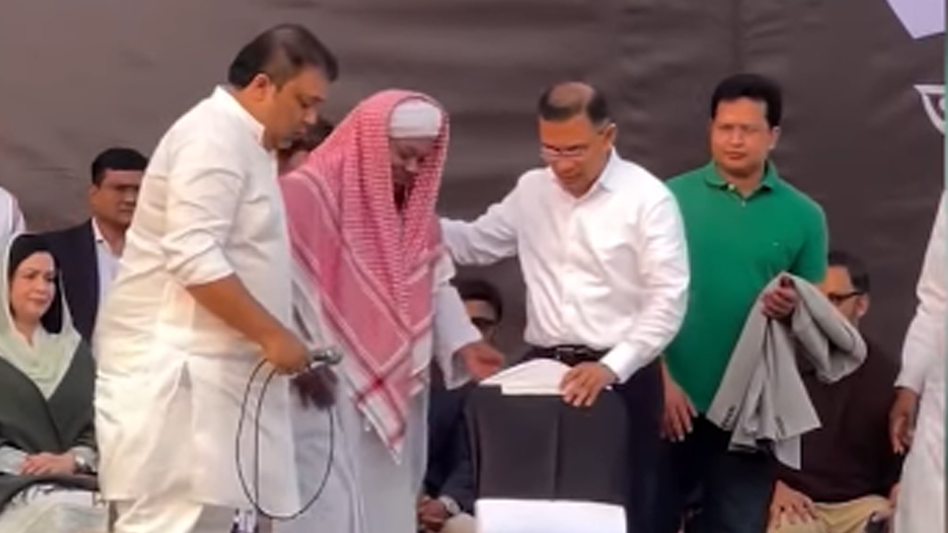 সাবেক প্রধানমন্ত্রী বেগম খালেদা জিয়া গত ৩০ ডিসেম্বর ভোরে মৃত্যুবরণ করেছেন। এরপর তার জন্য মাগফিরাত কামনা করে একাধিক দোয়া ও স্মরণসভায় যোগ দিয়েছেন বিএনপি চেয়ারম্যান ও খালেদা জিয়ার বড় ছেলে তারেক রহমান।মঙ্গলবার (২০ জানুয়ারি) রাজধানীর কড়াইলবাসীর পক্ষ থেকে মহাখালীর টি অ্যান্ড টি মাঠে দোয়ার অনুষ্ঠানে স্ত্রী ডা. জুবাইদা রহমানকে নিয়ে অংশ নেন তারেক রহমান। এতে দোয়া মোনাজাত পরিচালনা করেন মাওলানা মোহাম্মদ ইব্রাহিম। দোয়া অনুষ্ঠানের আগে মঞ্চে দেখা যায় একটি ব্যতিক্রমী ও মানবিক দৃশ্য। সাধারণত দোয়া অনুষ্ঠানে মোনাজাত পরিচালনা করা আলেমরা একপাশে বসেন। খালেদা জিয়ার দোয়া অনুষ্ঠানে ইমাম মাওলানা মোহাম্মদ ইব্রাহিম মোনাজাত পরিচালনা করেন মঞ্চে সবার সামনে বসে। পেছনের দিকে স্ত্রীসহ তারেক রহমান ও দলের নেতারা বসে মোনাজাতে অংশ নেন। আরও পড়ুন: ঢাকা-১৭: তারেক রহমানের সম্মানে প্রার্থিতা প্রত্যাহার করলেন এম সরওয়ার অনুষ্ঠানের ছড়িয়ে পড়া একটি ভিডিওতে দেখা যায়, সংক্ষিপ্ত বক্তব্য শেষে যখন খালেদা জিয়ার রুহের মাগফিরাত কামনা করে মোনাজাত শুরু হবে, ঠিক তখন তারেক রহমান ইমাম সাহেবের দিকে দৃষ্টি দেন এবং তাকে মঞ্চের সামনে বসানোর অনুরোধ জানান। তিনি (তারেক রহমান) নিজেই উঠে মঞ্চের সামনে একটি ফাঁকা চেয়ার এনে রাখেন এবং মাওলানা ইব্রাহিমের সঙ্গে সালাম বিনিময়ের পর সম্মানসহ সেখানে বসতে অনুরোধ করেন। এরপর ইমাম সাহেব মঞ্চের সামনে বসেই মোনাজাত পরিচালনা করেন। সামাজিক যোগাযোগ মাধ্যমে ভিডিওটি ছড়িয়ে পড়ে। এতে অনেকেই এমনভাবে আলেমকে সম্মান জানানোর চিন্তা করার জন্য তারেক রহমানকে ধন্যবাদ জানান। আরও পড়ুন: কড়াইলবাসীর উন্নত জীবন নিশ্চিতের প্রতিশ্রুতি তারেক রহমানের দোয়া মাহফিল সঞ্চালনা করেন ঢাকা-১৭ আসনে বিএনপির নির্বাচন পরিচালনা কমিটির প্রধান সমন্বয়ক আব্দুস সালাম। বেগম খালেদা জিয়ার দোয়া অনুষ্ঠানে আশপাশের এলাকার বিএনপি ও অঙ্গ সংগঠনের নেতাকর্মীরা অংশ নেন। তারেক রহমানের উপস্থিত হওয়ার আগে পুরো মাঠ লোকে লোকারণ্য হয়ে যায়। তারেক রহমান-১৭ আসন থেকে ত্রয়োদশ সংসদ নির্বাচনে প্রতিদ্বন্দ্বিতা করছেন। কড়াইল বস্তি, মহাখালী এই আসনের অন্তর্ভুক্ত।
