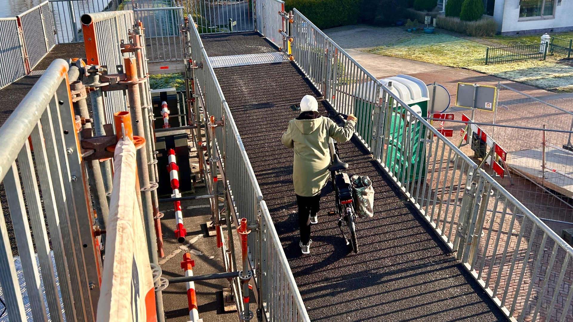 ‘Blij mee! Eindelijk kunnen we weer naar de overkant, even op de fiets naar Zuidhorn.’ Inwoners van Noordhorn reageren enthousiast op de tijdelijke fiets- en loopbrug die dinsdag is geopend bij de gestremde tafelbrug in Zuidhorn. Dat ze hun fiets een flink eind omhoog moeten duwen, nemen de meesten voor lief.