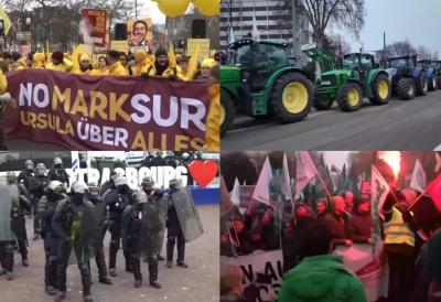 Hiljade poljoprivrednika, vozeći traktore i mašući zastavama, okupile su se danas ispred Evropskog parlamenta (EP) u Strazburu u znak protesta protiv trgovinskog sporazuma potpisanog sa Merkosurom, pred glasanje o tome da li ga poslati na reviziju Sudu pravde Evropske unije.