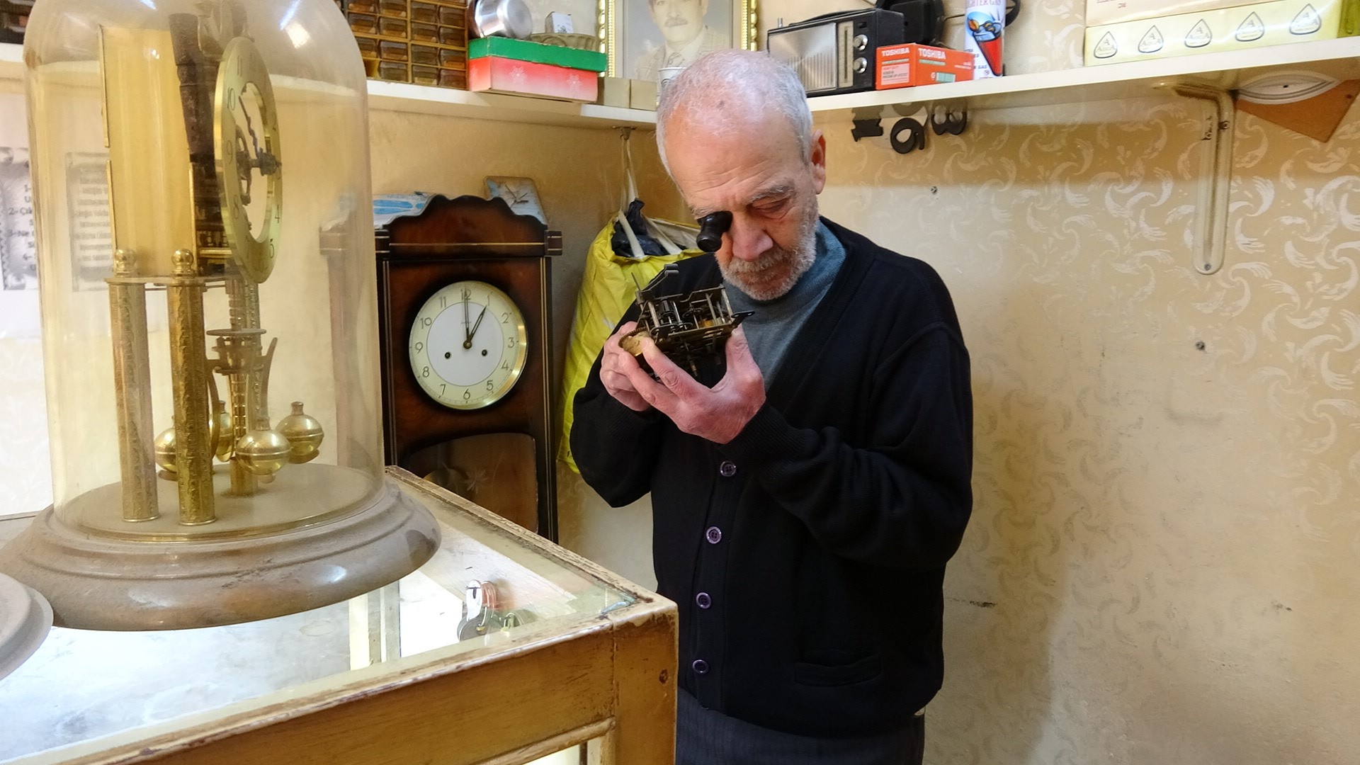 Kilis'te 41 yıllık saatçi Ahmet Çınaroğlu, 54 yıldır sürdürdüğü saat tamirciliğinde antika saatleri onararak mesleğini yaşatıyor.