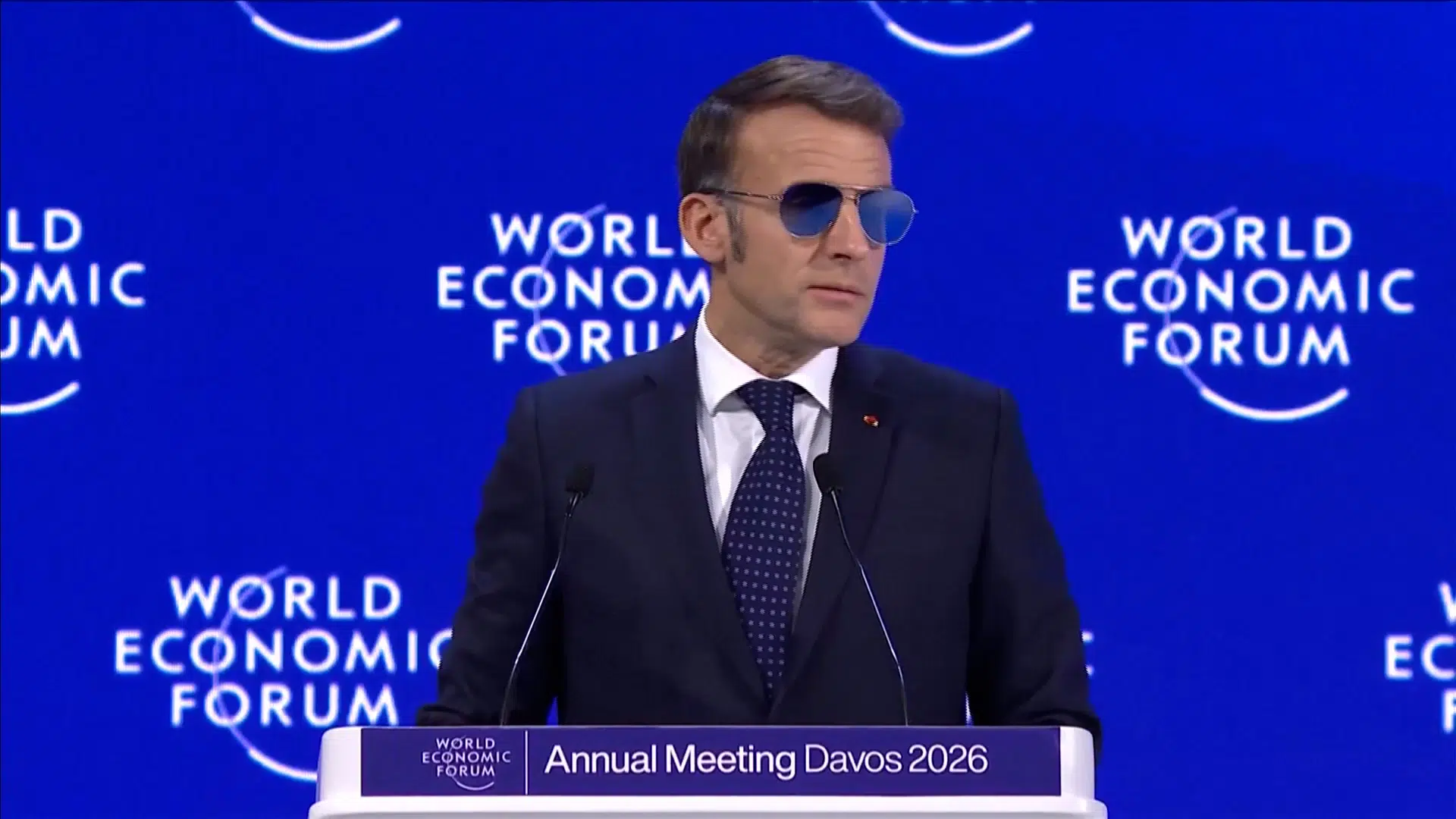 Iført blåtonede solbriller sendte Macron direkte besked til Trump i Davos: »Vi foretrækker respekt frem for bøller«