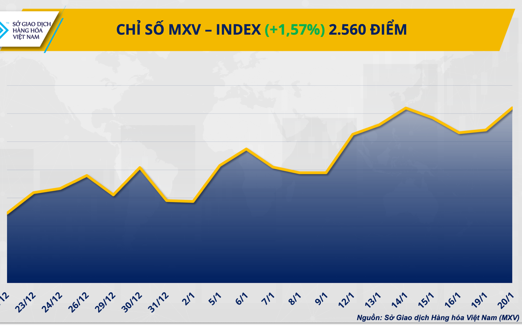 (Chinhphu.vn) - Kim loại quý, trong đó có bạch kim tiếp tục gây chú ý trong phiên giao dịch ngày 20/1 khi tăng vọt 5,5%, quay lại vùng đỉnh cuối năm 2025. Ở chiều ngược lại, áp lực nguồn cung tại Nga đang lan rộng sang thị trường lúa mì thế giới. Đóng cửa, lực mua áp đảo kéo chỉ số MXV-Index tăng gần 1,6%, lên mức 2.560 điểm.