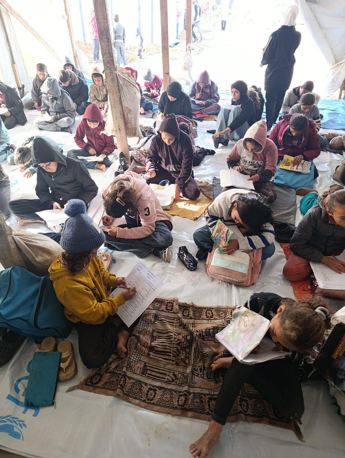 La escuela provisional Aid for Gaza, que ha impulsado la asociación Inca Mallorca Solidària junto a otras ONG españolas, ha supuesto un alivio para los más de cuatrocientos niños y niñas que cada día acuden a las carpas que se han habilitado a modo de aulas. Por una parte, las nueve profesoras y dos psicólogas que atienden a los menores están logrando que los alumnos sigan, dentro de los posible, un proceso educativo básico que les aleje de los horrores que les ha tocado vivir en este último año. Además, se ha convertido en una vía para ofrecer alimentos a estos menores, algunas veces el único del día, a modo de merienda.