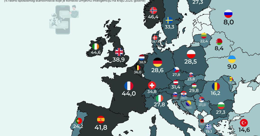 Na karti je Bosna i Hercegovina za naznačenih 19,5% daleko od zapadnoeuropskog prosjeka, ali u rangu zemalja istočne Europe