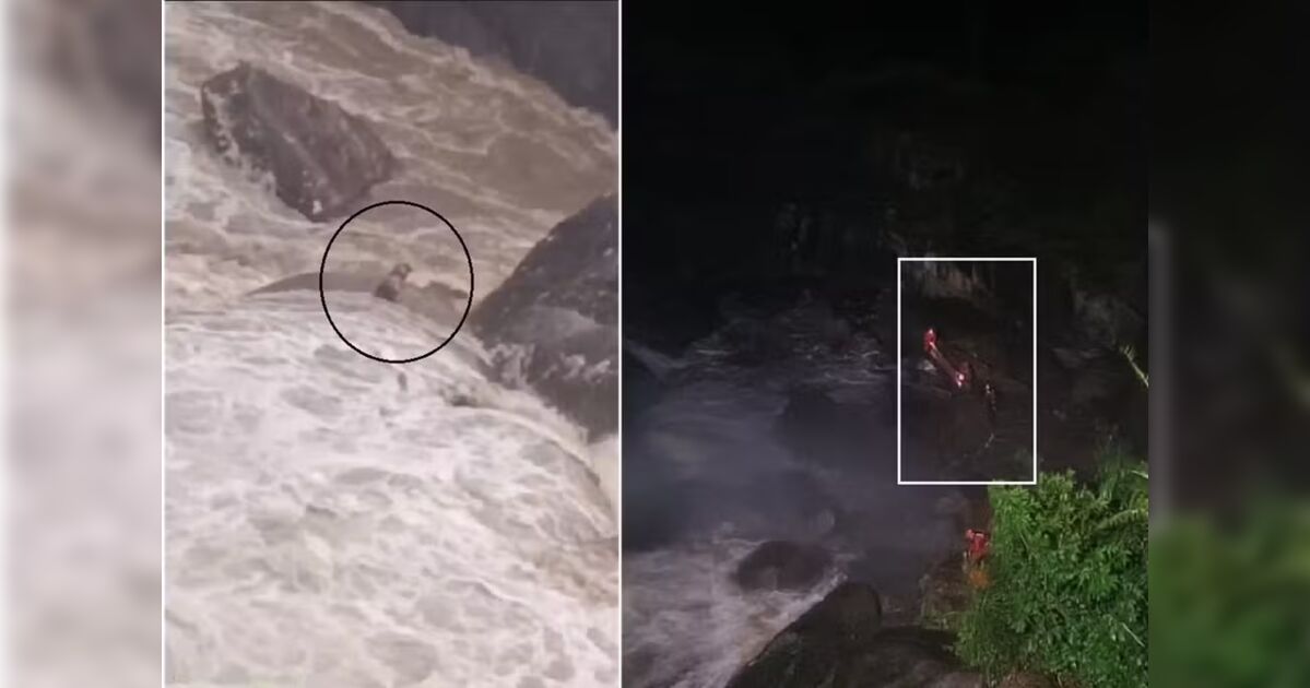 Cão cego e surdo é regatado em cachoeira após ficar ilhado; veja vídeo