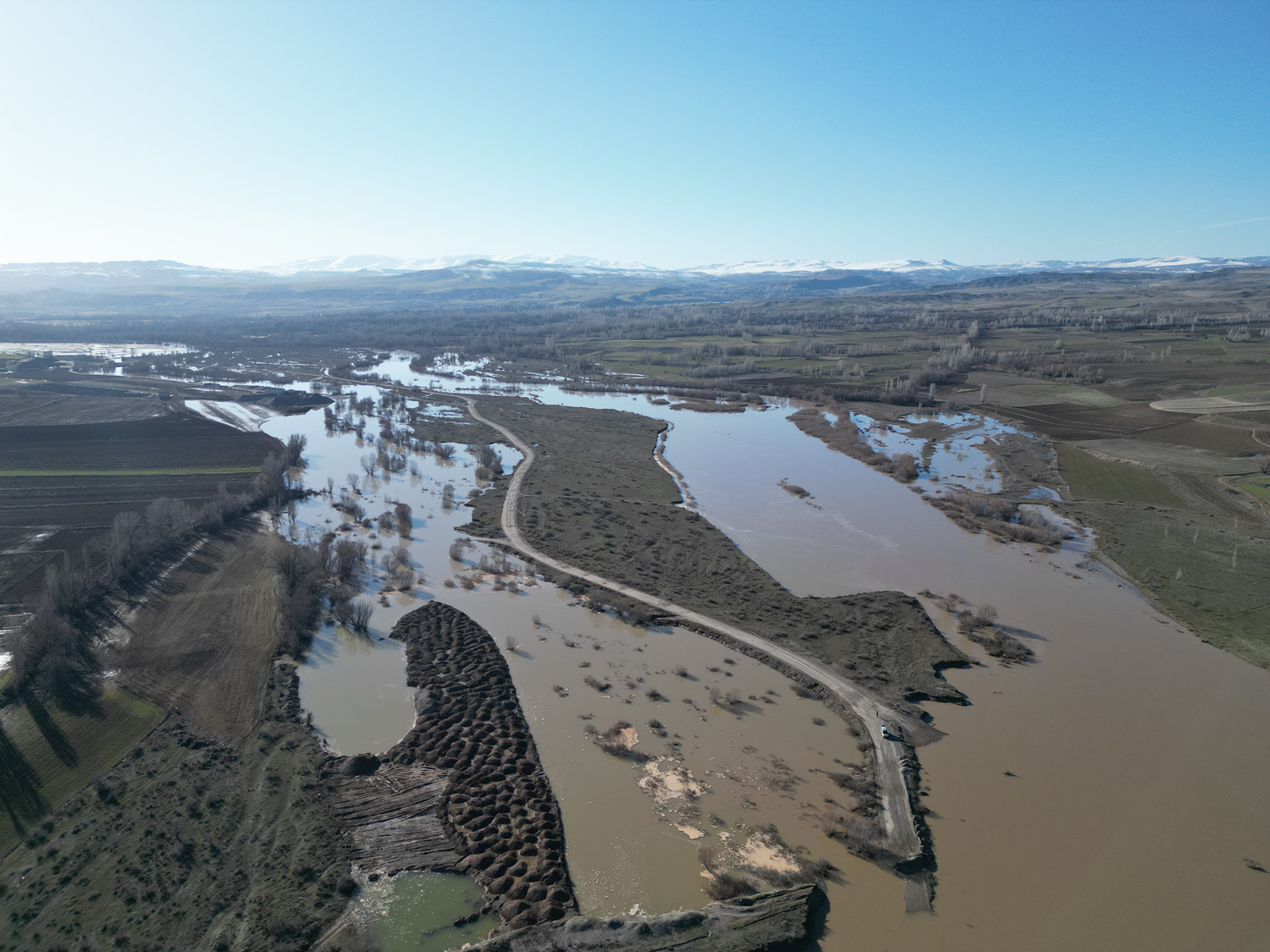 Sivas'ın Gemerek ilçesinde karların erimesi ve yağışların ardından Kızılırmak Nehri'nin taşması sonucu ekili tarım arazileri su altında kaldı.