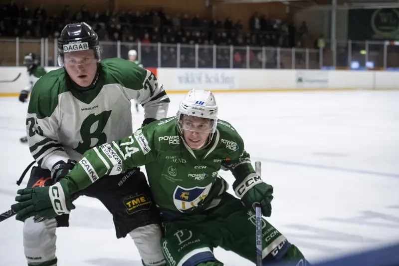 IFK Mariehamns Jesse Kaupinsalo blev stor matchhjälte då ha slog in segerpucken till 4–3 i den första förlängningsperioden i det första playoff-mötet mot Bålsta.