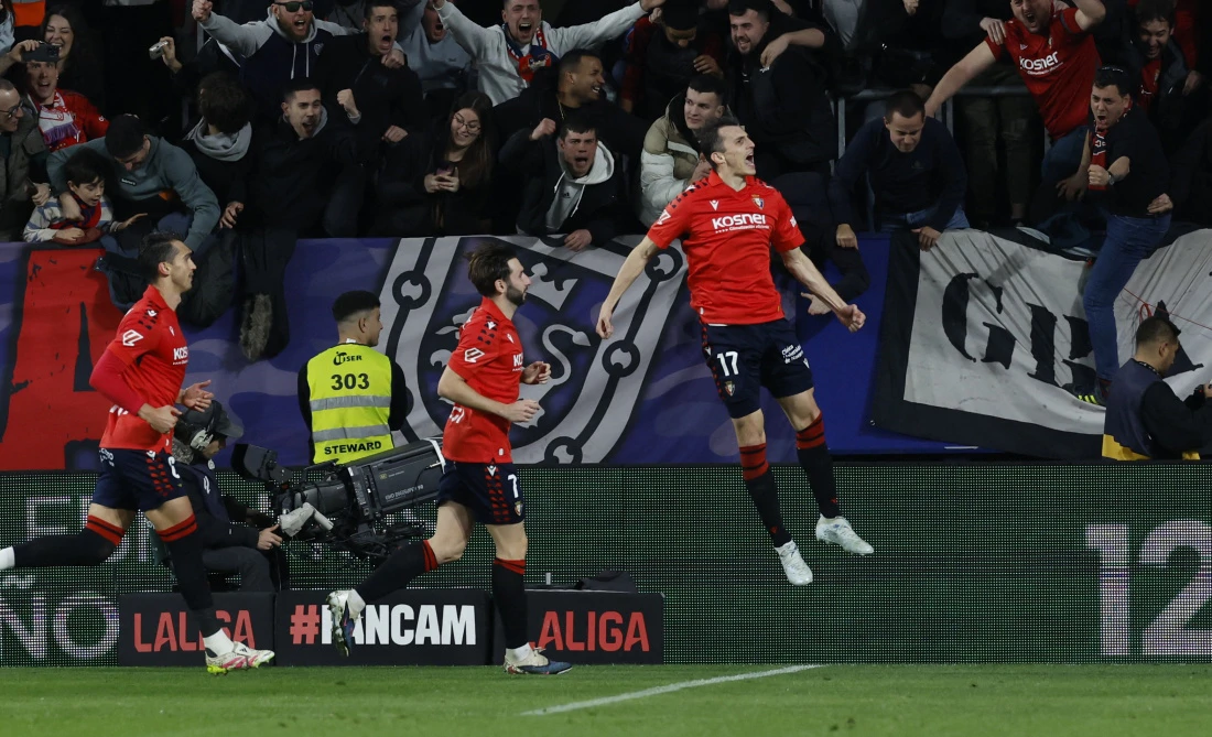 Nogometaši Osasune pobijedili su vodeći madridski Real 2-1 na domaćem terenu, u uzbudljivoj utakmici 25. kola španjolske La Lige.