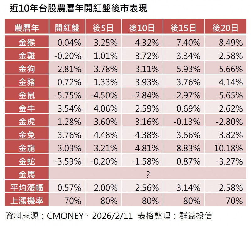 台股金馬年即將在明日開盤,根據群益投信統計資料顯示,台股近十年開紅盤當天上漲機率是7成,當日平均漲幅0.57%。群益投信台股研究團隊表示,近十年台股農曆年開紅盤後5日、1...…