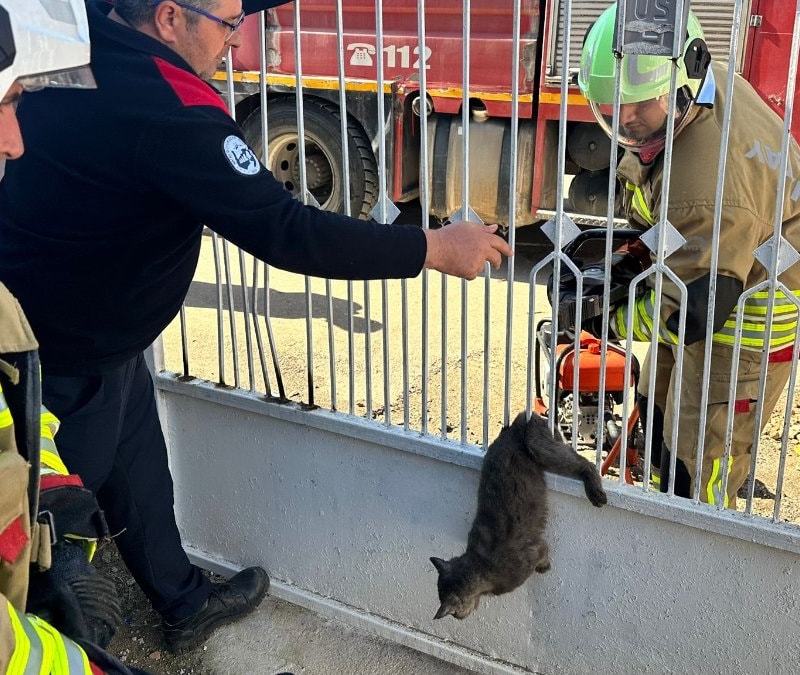 Kırıkhan ilçesinde demir kapı korkuluğuna sıkışarak mahsur kalan kedi, itfaiye ekiplerinin müdahalesiyle kurtardı.