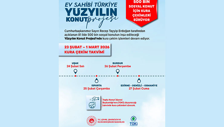 Bakanlıktan yapılan yazılı açıklamaya göre; Toplu Konut İdaresi (TOKİ) Başkanlığı’nın hayata geçirdiği Yüzyılın Konut Projesi’nin kura çekimlerinde 8 hafta geride kaldı. 29 Aralık 2025’te başlayan kura süreci, 21 Şubat Cumartesi Bursa’da 17 bin 225 konutun daha hak sahiplerinin belirlenmesi ile devam etti. 29 Aralık 2025- 22 Şubat 2026 tarihleri arasında, Adıyaman, Şırnak, Hakkari, Siirt, Van, […] The post Bakan Kurum, 23 Şubat-1 Mart kura takvimini açıkladı first appeared on Yeni Meram - Konya Haberleri - Güncel Ekonomi ve Politika Haberleri .
