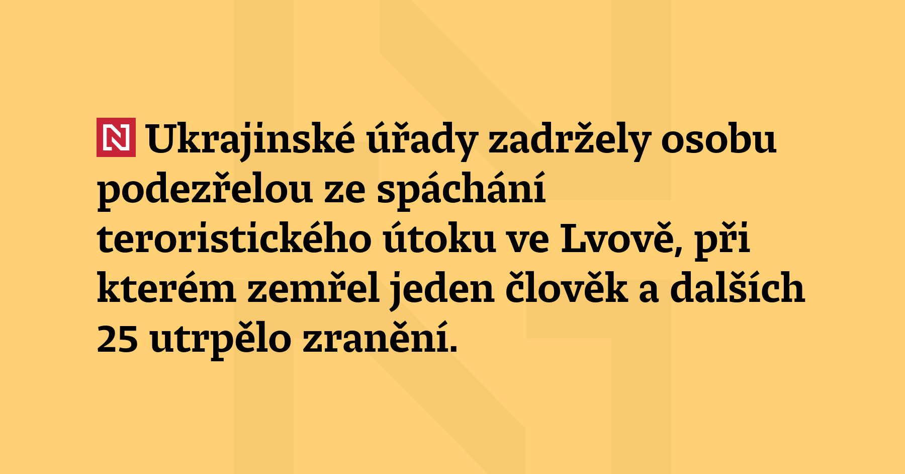 Ukrajinské úřady zadržely osobu podezřelou ze spáchání teroristického útoku ve Lvově, při kterém zemřel jeden člověk a dalších 25 utrpělo zranění. Informuje o tom prezident země Volodymyr Zelenskyj s odkazem na vyjádření ukrajinského ministra vnitra Ihora Klymenka. Podle Zelenského právě „probíhají nezbytné procesní úkony týkající se zadržené osoby“. „Ministerstvo vnitra bude podle potřeby poskytovat další informace,“ napsal Zelenskyj.