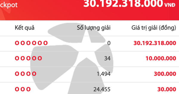 Tối 22.2, Vietlott thông báo kết quả quay số mở thưởng loại hình xổ số Mega 6/45, tuy nhiên không có người trúng giải độc đắc nào nên số tiền cộng dồn là 30,1 tỉ đồng.