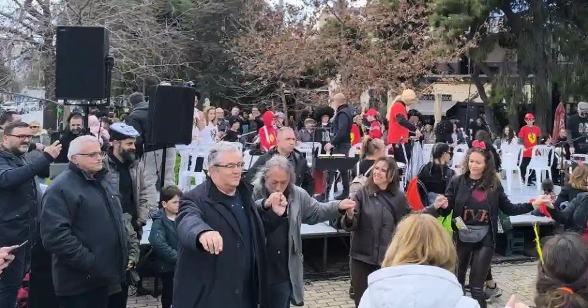 Στο γλέντι στην Πλατεία Ηρώων, ο Δημήτρης Κουτσούμπας χόρεψε και έναν παραδοσιακό χορό, μαζί με τον δήμαρχο Χαϊδαρίου