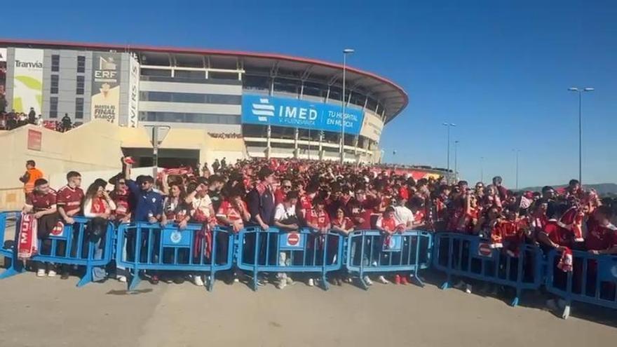 La afición del Real Murcia espera la llegada del equipo al estadio Enrique Roca