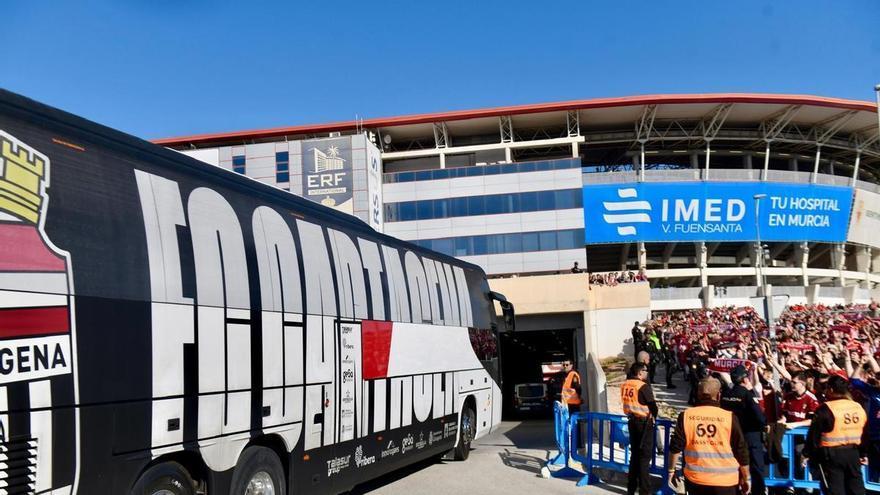 El FC Cartagena llega al estadio para el derbi ante el Murcia entre cánticos en contra de seguidores granas
