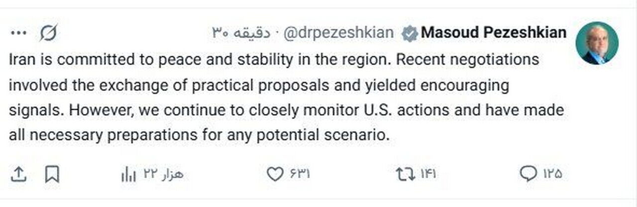تهران - ایرنا - مسعود پزشکیان رییس جمهوری با بیان این که مذاکرات اخیر نشانههای امیدوارکنندهای به همراه داشت، گفت: آماده اقدامات احتمالی آمریکا هستیم.