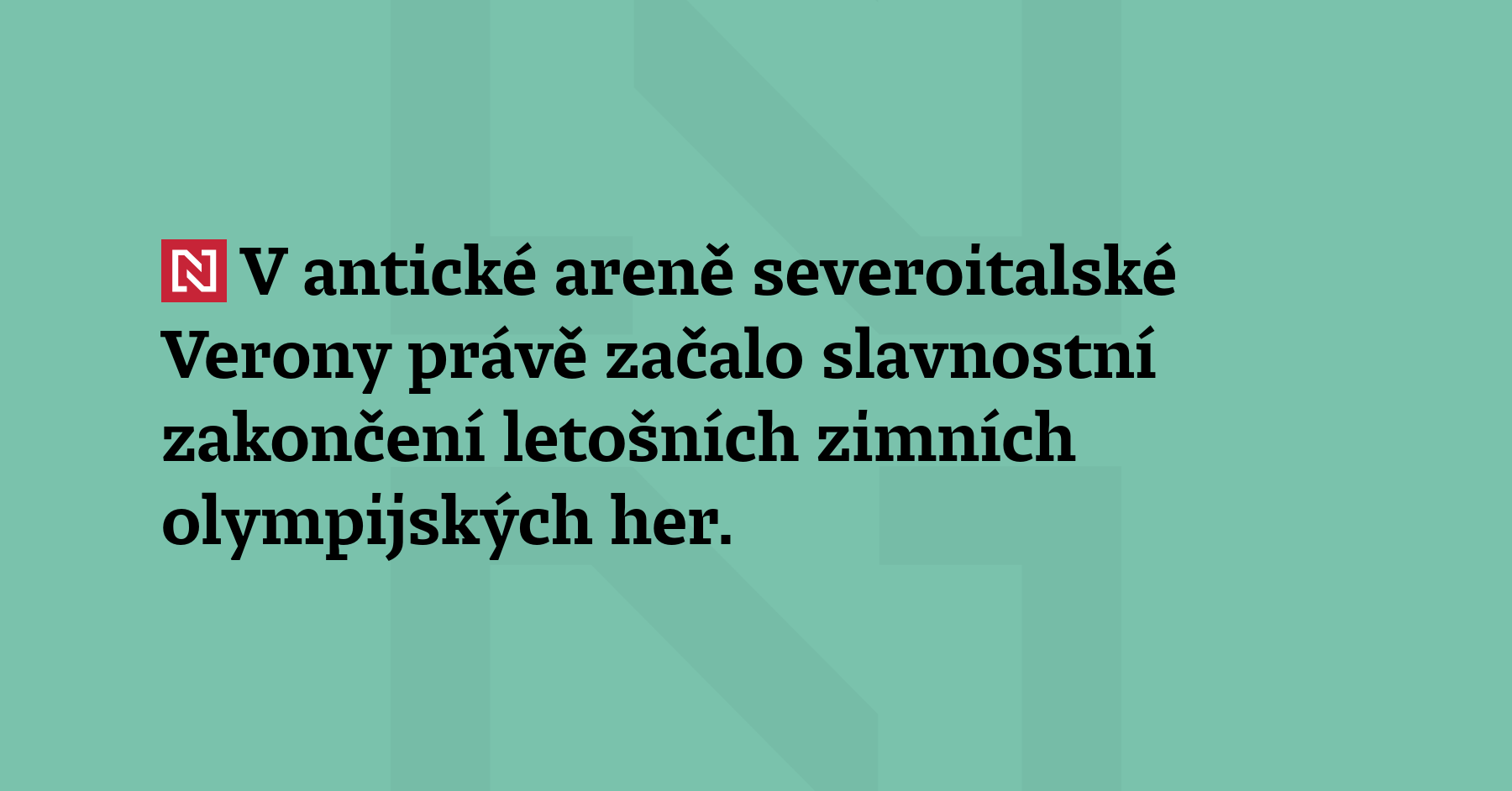 V antické areně severoitalské Verony právě začalo slavnostní zakončení letošních zimních olympijských her. Ceremoniál potrvá zhruba dvě a půl hodiny, českými vlajkonoši budou Metoděj Jílek a Martina Sáblíková.