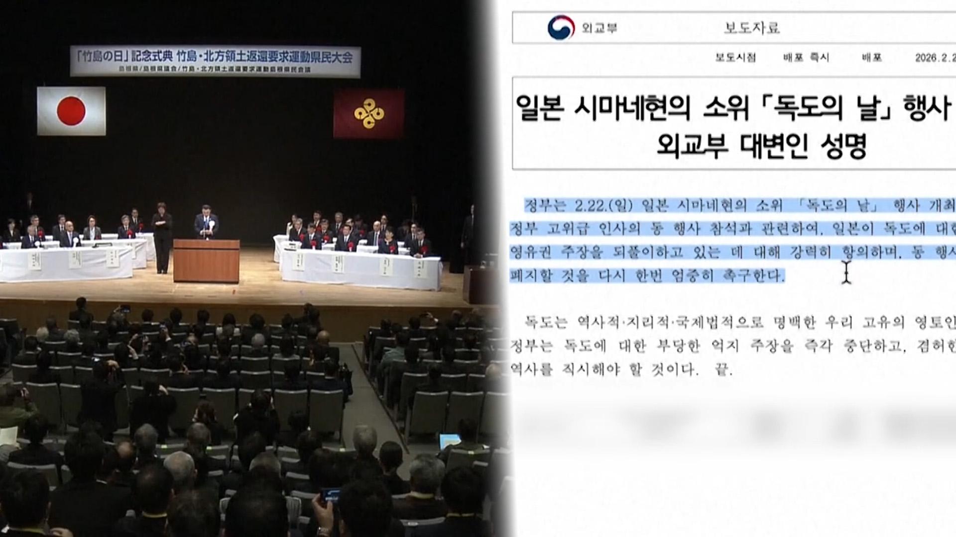 [앵커] 일본이 어제(22일) '다케시마의 날' 행사를 열어 독도가 일본 땅이라는 억지 주장을 되풀이했습니다. 일본 정부는 14년 연속 행사에 정무관을 파견했는데요. 앞서 일본 정부가 장관급 인사를 파견할 수 있다는 관측도 나왔는데, 한일관계 등을 고려한 것으로 보입니다. 오주현 기자입니다. [기자] 일본이 '다케시마의 날'을 맞아 올해도 어김없이 독도가 일본 땅이라는 억지 주장을 또 펼쳤습니다. 후루카와 나오키 내각부 정무관은 이날 행사...