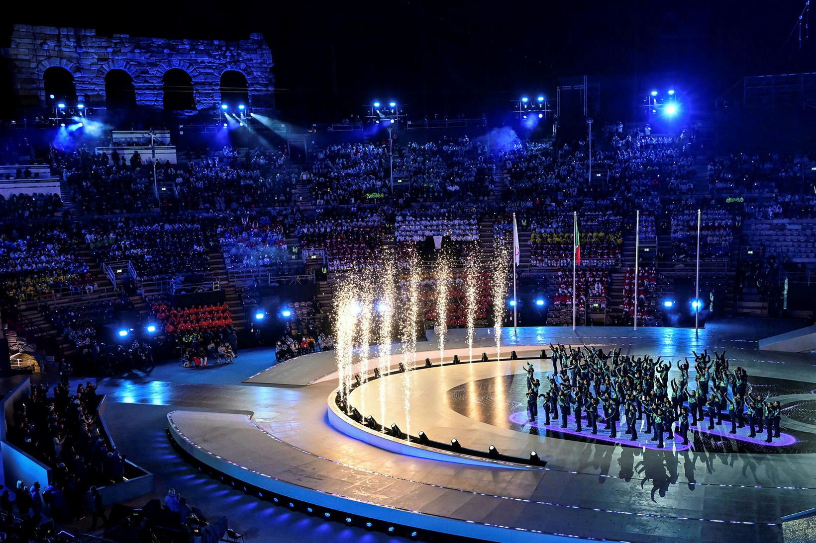 Hundruð manna komu saman á götum Veróna á Norður-Ítalíu í dag, fyrir lokahátíð Ólympíuleikanna, til að mótmæla efnahagslegum og umhverfislegum kostnaði vetrarleikanna.