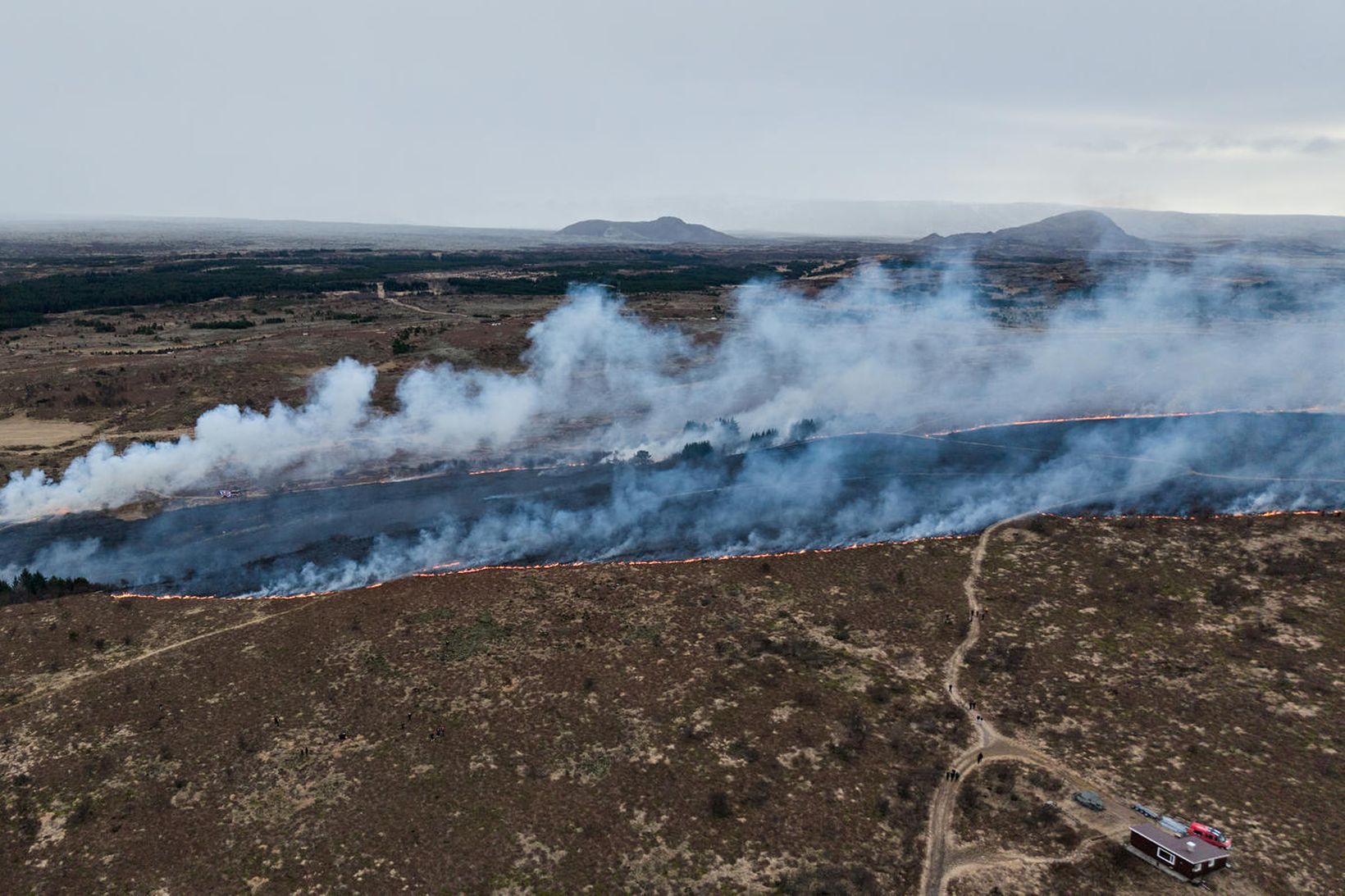 Ein stöð slökkviliðs höfuðborgarsvæðisins er farin aftur á vettvang sinueldsins í Vatnsendahlíð nærri útivistarsvæðinu í Guðmundarlundi og byggð í Þingahverfi í Kópavogi.