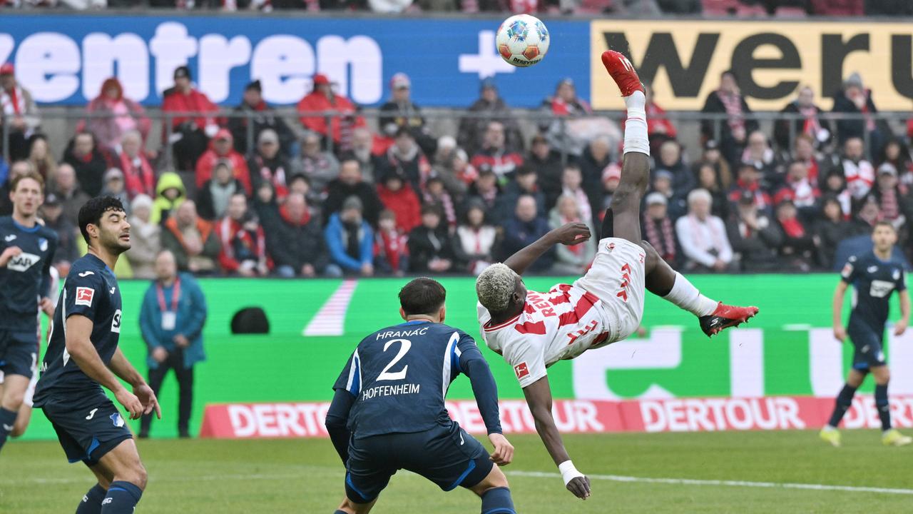 Mit einem traumhaften Fallrückzieher besorgt Ragnar Ache für den 1. FC Köln gegen 1899 Hoffenheim die Führung. Für einen Sieg reicht es allerdings nicht.