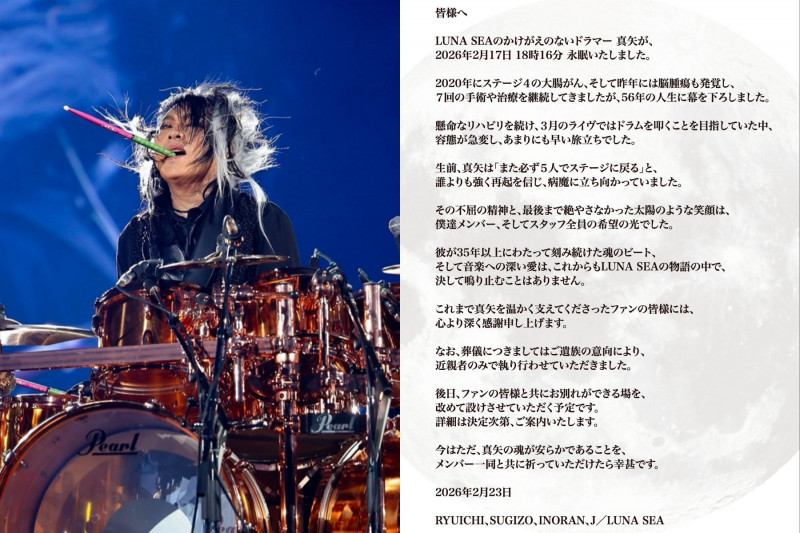日本天團「LUNA SEA」月之海在日本時間23日凌晨發表聲明,宣布鼓手真矢在2月17日病逝,享年56歲,震驚日本樂壇。聲明中指出,真矢在2020年被診斷出大腸癌4期,去年又發...…