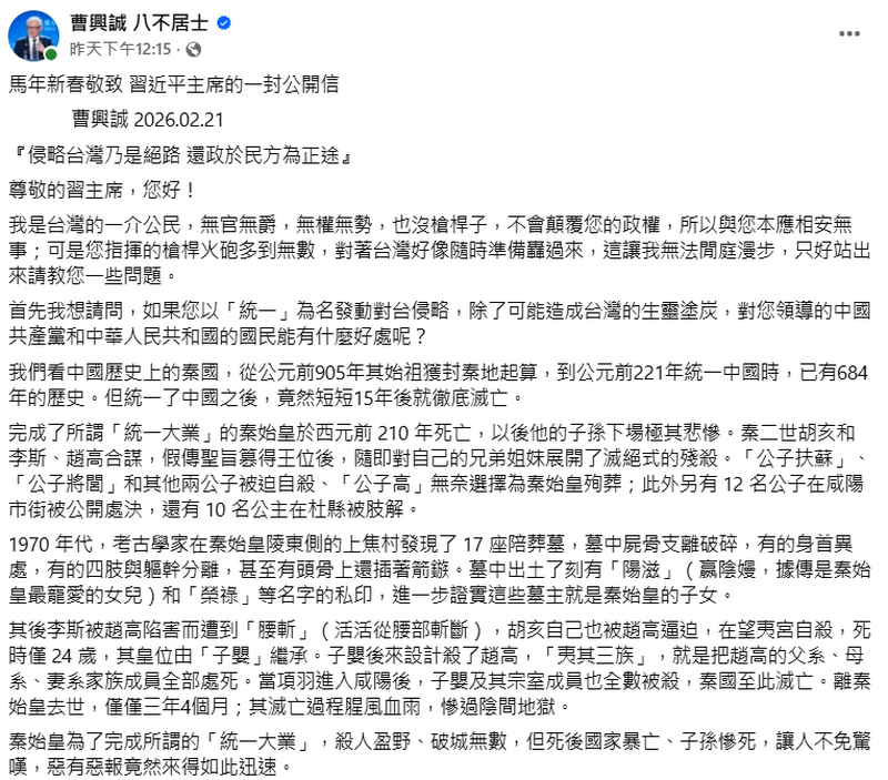 近日讀到曹興誠先生在2026年2月21日寫給習近平主席的公開信,最觸動人的不是措辭的鏗鏘有力,而是他把問題拉回一個文明社會最基本的假設:國與國、人與人之間若以武力脅迫為前提,...…