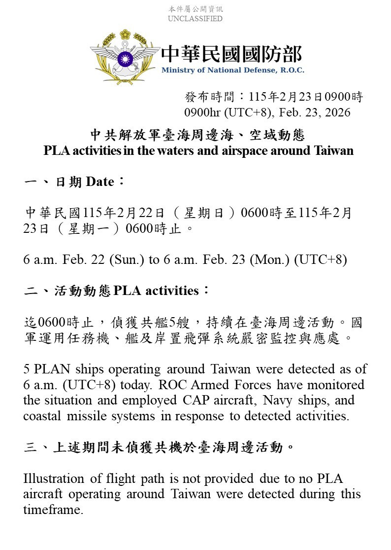 農曆春節進入大年初七,中共繼初三(19日)在我海空周邊實施聯合戰備警巡後,灰色地帶襲擾仍持續。國防部今(23)日表示,截至今日上午6時,過去24小時僅偵獲共艦5艘在台海周...…